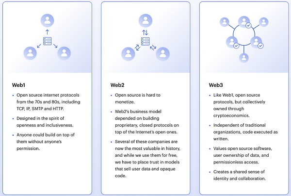 Web1 只讀信息,Web2 讀取+書寫信息,Web3 讀、寫 & 擁有信息