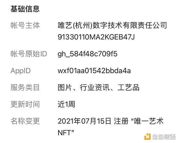 另一邊,記者查看“唯一藝術NFT”的賬號主體信息發現,該小程序主體“唯藝(杭州)數字技術有限責任公司”已在近一周的時間內,將服務類目更改為了“圖片、行業資訊、工藝品”。
