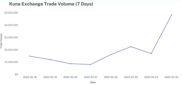 加密貨幣正在成為烏克蘭民眾的安全所系:根據forkast的報道,從2月24日到2月25日,Kuna交易所的加密貨幣交易量出現激增,越來越多的烏克蘭法幣被兌換為加密貨幣。