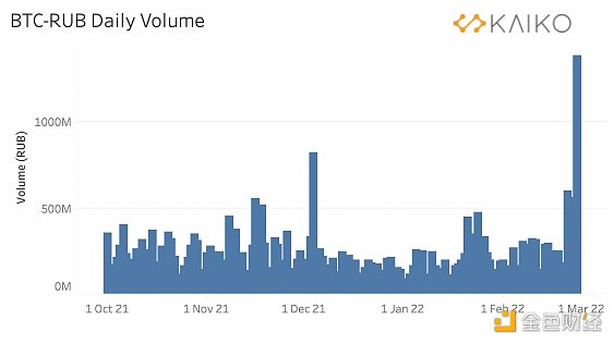 在被SWIFT除名后,超過1000BTC的數量激增,盧布與USDT之間的計價交易量達到2940萬美元,為9個月以來最高水平,一周內增長了兩倍多。另外,俄羅斯交易所的BTC出現溢價,3月1日BTC單價達到$61346/枚,溢價達到1.8萬美元,有明顯的法幣資金出逃跡象。