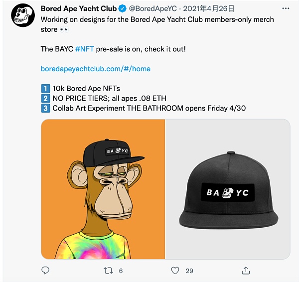 Yuga 的主動運營能力也異常專業。翻閱BAYC的推特,可以發現,自BAYC預售一開始,Yuga Labs就強調NFT持有者的「會員歸屬感」,并親力親為制造實物品牌周邊(如鴨舌帽、T恤衫等),營造IP和社區氛圍。
