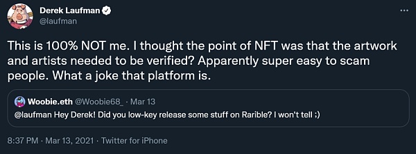 詐騙和抄襲問題也困擾著藝術家或創作者。例如,Marvel超級英雄故事的設計者,數字藝術家Derek Laufman看到他的作品在他不知情的情況下在NFT平臺Rarible上被拍賣。類似這樣的故事很常見。