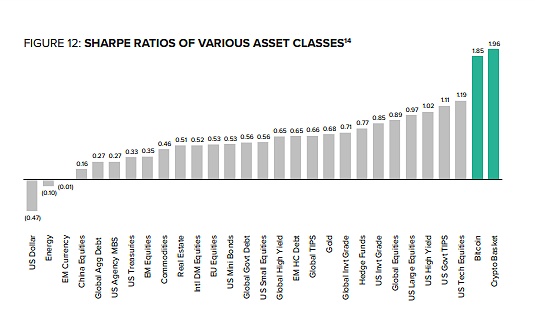 加密資產比其他資產類別產生了更高的絕對回報,但具有更高的絕對波動性,這已不是秘密。雖然有些人認為這是一個問題,但鮮為人知的是,加密資產也能夠提供比其他資產類別更高的風險調整后回報。在過去三年中,與所有主要資產類別相比,加密資產的夏普比率最高。換句話說,加密資產具有更高的絕對波動性,但與其他資產類別相比,它們為承擔該風險的投資者提供了更豐厚的回報。