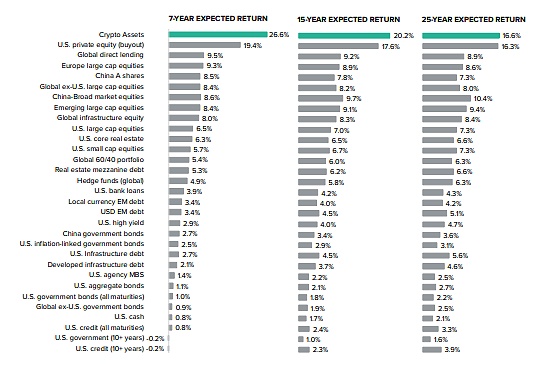 我們的加密資產不僅能為投資者提供過去的利益,而且能為投資者提供未來的利益。基于Grayscale當前的長期加密市場假設,我們認為,在與其他替代方案一致之前,該資產類別在未來幾十年內可以提供比幾乎所有其他資產類別更高的預期回報。