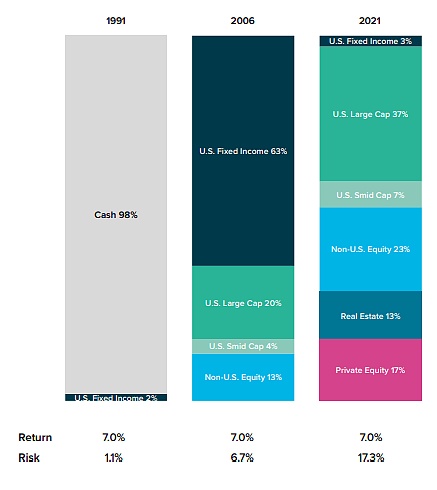 估值的增加進一步加劇了傳統資產的預期回報在過去30年中不斷下降的環境。因此,投資者被要求將其投資組合中越來越多的部分分配給流動性較低的私人市場替代資產,同時承擔更大的波動性,以保持7%的預期回報率。