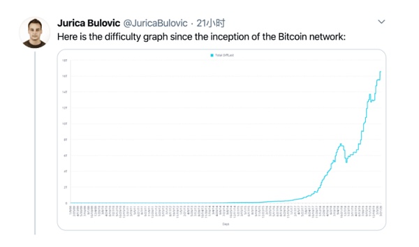 下圖展示了自比特幣網絡成立以來挖礦難度走勢: