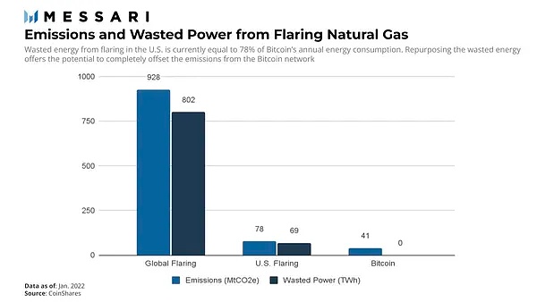 至少可以說,美國因燃燒而浪費的能源數量是巨大的。Coinshares 公司估計,美國每年有 69 太瓦時的電能浪費在燃燒中,這導致了 78 百萬噸二氧化碳當量(MtCO2e)的碳排放。換句話說,美國燃燒浪費的能源目前相當于全球比特幣網絡使用的能源的 78%。浪費的燃燒能源不僅可以被重新利用,為比特幣網絡的很大一部分提供能量,而且還可以以減少碳排放的方式進行。