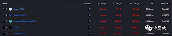 鎖倉量方面目前位于公鏈第六位,低于ETH、Terra、BNB、Avalanche、Fantom。當前TVL為6.6B$,雖在鎖倉價值上呈階段性下降趨勢,但SOL鎖倉份額基本穩定波動。主要鎖倉金額分布在Serum、Raydium 、Marinade Finance 、Quarry、Solend 上,有趣的是鎖倉份額排名前20的協議中除lido(排名12)和RenVM(排名20)外,其余均是Solana本土協議,這或許也是Sol鎖倉量低于Terra等公鏈項目的原因之一。