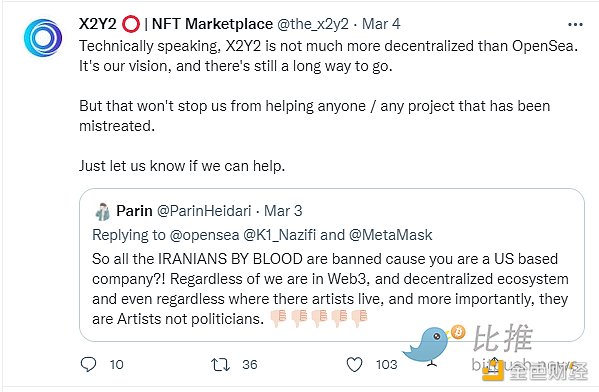 OpenSea 官方給出的理由也很簡單,因為 Parin 是伊朗用戶。其發言人表示服務條款明確禁止受制裁的用戶或受制裁地區/國家的用戶使用 OpenSea 的服務,其中包括伊朗、朝鮮、敘利亞和俄羅斯等多國用戶。