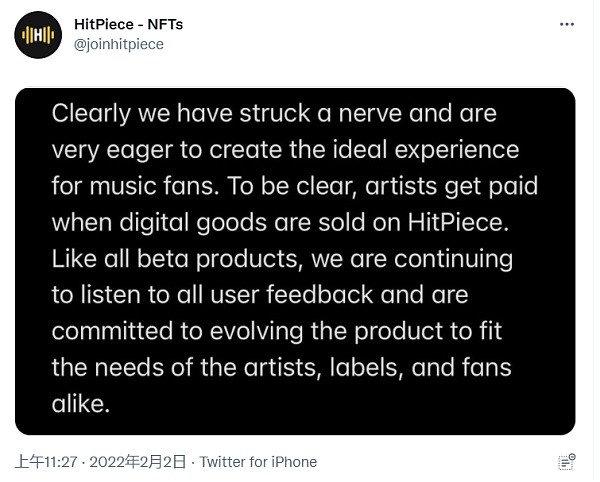 這導致HitPiece最終被迫發表道歉聲明,并表示:“當數字商品在HitPiece上銷售時,藝術家會得到報酬。”