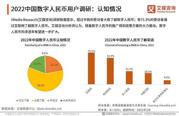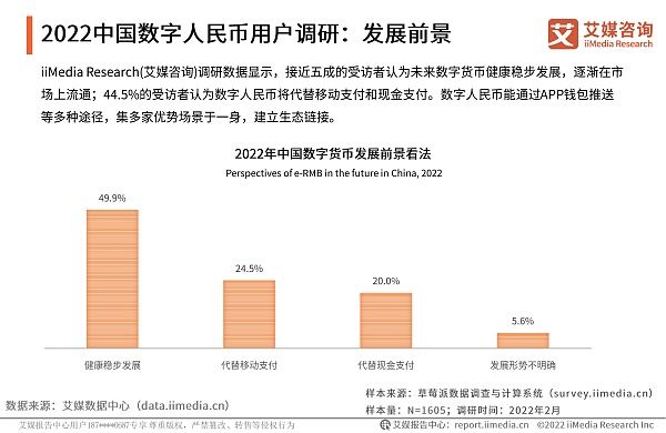 iiMedia Research(艾媒咨詢)調研數據顯示,近五成的受訪者認為未來數字貨幣健康穩步發展,逐漸在市場上流通;44.5%的受訪者認為數字人民幣將代替移動支付和現金支付。