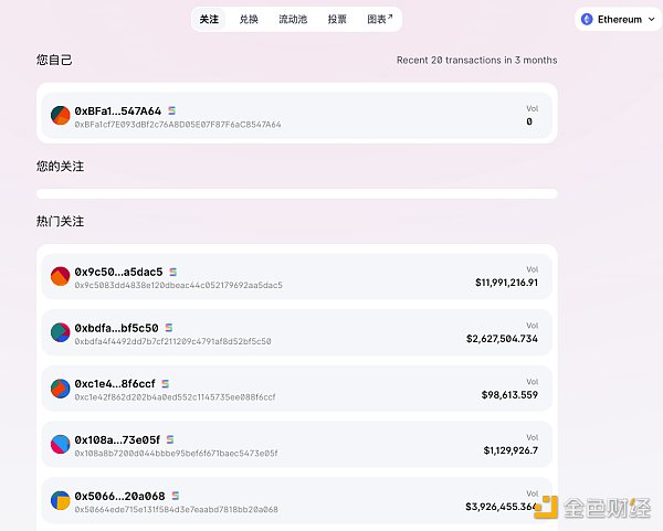 當我們完成5Degrees登錄后,可以打開支持ERC-1155協議支持的應用,就可以發現一些公開數據的用戶,例如uniswap,你可以關注一些用戶的地址顯示的公開數據。這就像在即刻里公開的持倉一樣。而可以像這樣如法炮制的應用有很多,只是需要支持該協議并且開發了相應頁面的應用更多一些。