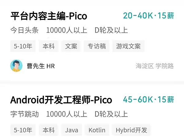 最近,字節先是把大量內容高層內部調動到了Pico項目,包括西瓜視頻負責人任利鋒、抖音綜藝負責人宋秉華、抖音娛樂總監吳作敏在內的幾人先后轉崗。之后,又在幾個重點招聘的網站上大量發布招聘信息,尤其是加大了對于Pico平臺內容和開發工程師的招聘需求。