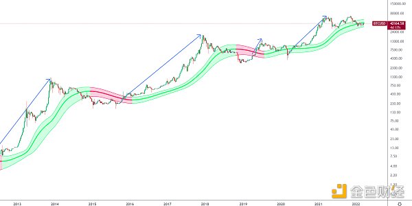如圖所示,目前BTC周線已經跌破通道中軌線,從今年1月跌破到目前仍未能重新站上,而前期歷史上一旦跌破遲遲不能站回,后面往往還會出現較大級別的探底行情,2014年熊市、2018年熊市包括2020年均有這種走勢,而一般這種極端行情出現意味著BTC將要到達這一輪熊市的大底區域,所以后面要注意這個風險,本周中軌線點位43685美金,我們還可以發現一般BTC從熊底區域向上回升,一旦重新站穩該通道內部,后面往往也是一輪牛市行情的啟動,這將有助于我們把握主升行情機會。
