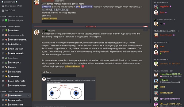 Discord運營是個繁重的工作,但通過跟頭部項目社區學習,也可以快速學會,包括但不限于頻道的搭建、第三方工具的使用、AMA等各種活動的舉辦、Mod的招募和管理、大量白名單的發放等等。如果是做全球性的NFT項目,英語是一個比較關鍵的事項,比如做AMA,需要的英語水平是非常高的,不然難以應付。另外需要管理來自全球的Mod,不同時區的Mod來實現24小時值守。