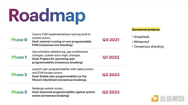 此外Filecoin還發布了FVM路線圖,FVM將分階段上線,2022年第1季度計劃引入協議分叉,在開發者可編程之前引入準備性調整,包括Gas機制和架構調整,隨后2022年2季度將引入可編程性,重新設計系統角色和更深層次的協議更改,使其更容易針對系統角色進行編程。
