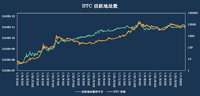 對數坐標系下,我們可以看到活躍地址數的平方和比特幣的價格之間存在較明顯的對應關系。根據2015-2017年比特幣上述兩個數據的背離,可以推測上一個牛市比特幣經歷了先價值回歸后過度狂熱的階段;同時似乎可推測目前比特幣的價格與價值間無太大背離。