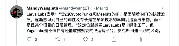 近期行業流量的焦點當屬 BAYC 和它的母公司 Yuga Labs,3 月 12 日,當看到 Yuga Labs 從 Larva Labs 手中收購 Crypto Punks 和 Meebits 系列的時候,我在推特上感嘆了 Yuga Labs 的格局,在這個收購的故事中,Larva Labs 更像一個頂級 IP 的孵化工廠,但 Yuga Labs 是不僅自有還能收購賦能的 IP 運營平臺,前者像皮克斯,后者則是迪士尼。