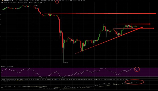 從周二開始,幣價運行區間逐步收窄。周三下午幣價再次沖高后,于1小時K線圖中呈現出較為明顯的RSI指標的看跌背離,隨后快速回調。但之后兩次的向下測試都被位于 $6450 的支撐位守住。另外,我們可以觀察到幣價在多個1小時K線內出現脈沖式漲跌,但整體上幣價對于上方 $7000 阻力位的挑戰并不積極,同時成交量未見起色。