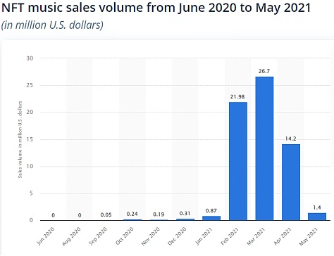 據全球領先研究型數據統計平臺Statista顯示, NFT 音樂市場銷售額在2021年1月達到90 萬美元,2月銷售額達到2200萬美元,較 1 月增長24倍,并于3月繼續上漲至2600萬美元。