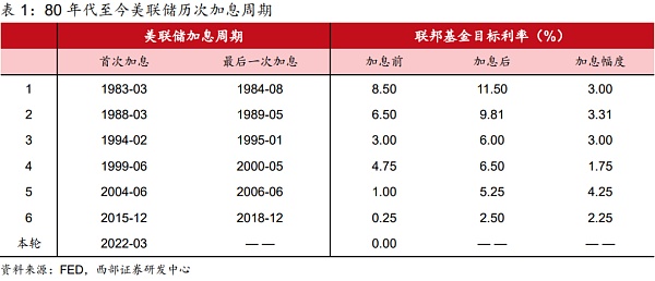根據西部證券的數據統計,80 年代以來美國共經歷 6 輪加息周期: