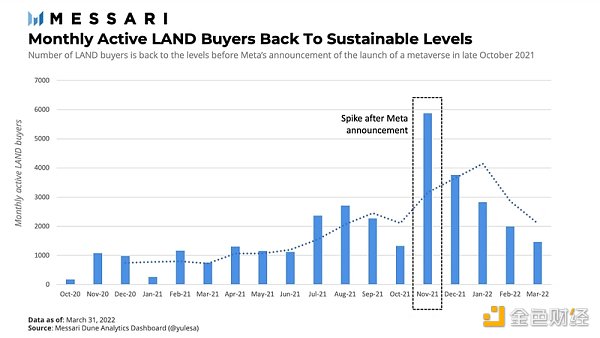 與此同時,相對于 2021 年第二季度,初級 LAND 銷售增長了 23%。初級銷售的對象是新發行的 LAND 地塊,通常出售給合作伙伴或通過拍賣。盡管如此,2021 年第一季度,主要 LAND 銷售額(1600 萬美元)僅占市場 LAND 總銷售額(1.36 億美元)的 12%。