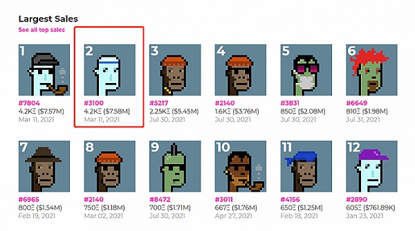2021年3月11日,數字藝術家Beeple創作的NFT藝術品《Everydays -The First 5000 Days》在佳士得拍出了6934.6萬美元的天價,約合人民幣4.5億,震驚加密圈和藝術界。被譽為NFT鼻祖的CryptoPunks曾經只是一組免費發放的廢棄頭像,截至今年4月初,CryptoPunks市值達到16.6億美元,交易總額高達27.1億美元。其中CryptoPunk#3100更是于2021年8月2日刷新了NFT拍賣歷史最高成交記錄,最終成交最高價42000枚ETH,約合10860萬美元,為目前世界上單價最高的NFT作品。