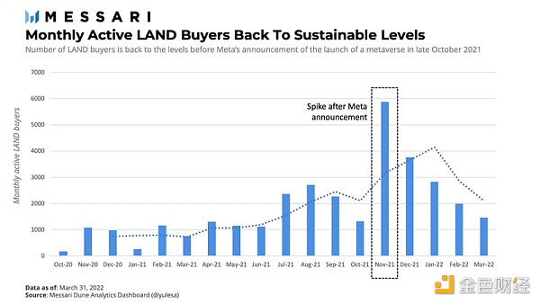 每月活躍 LAND 買家的數量回到了 Meta 在 2021 年 10 月下旬宣布之前的可持續水平。這提出了一個問題:鑒于目前只有有限的用戶能夠承載和貨幣化體驗,是什么推動了 The Sandbox 虛擬世界中數字土地的價值?