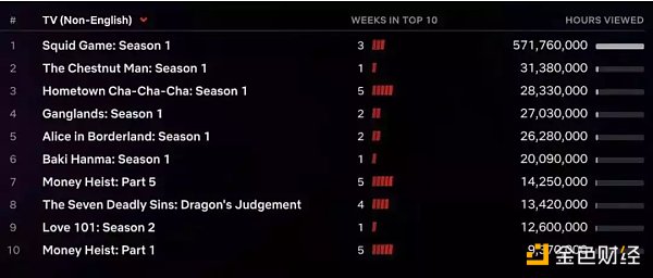 Netflix 發布了節目熱度前 10 名的排行榜單(其他流媒體甚至沒有),可這樣一份頂部榜單中也出現了冪律分布的情況。頭部節目可能比排名第 10 的節目更受歡迎 5-63 倍。