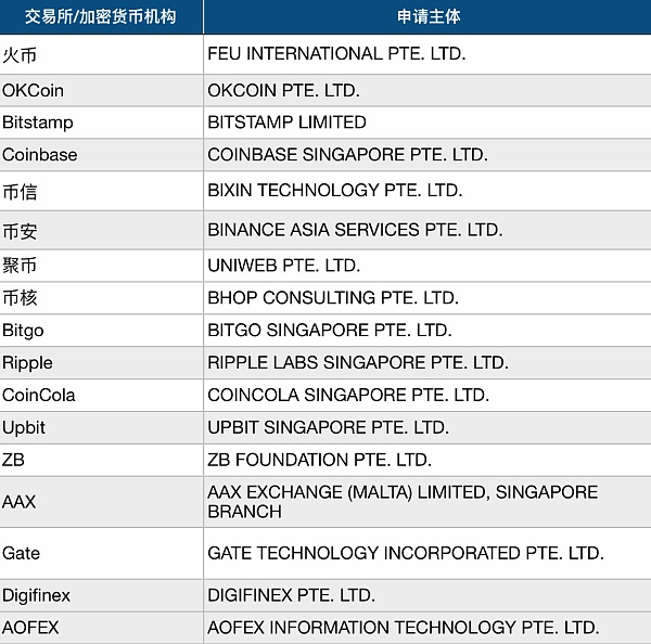 下表為金色財經記者整理的,位于新加坡金管局豁免名單中的交易所或者加密貨幣機構名單(持續更新)。