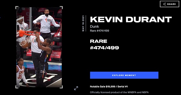 第一批含有凱文-杜蘭特扣籃片段的NFT賣出了近20,000美元。圖片來源:NBA Top Shot。