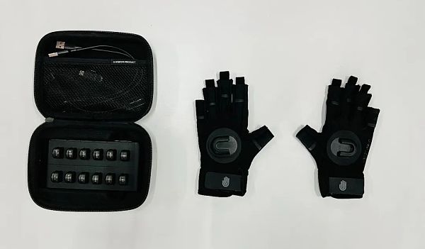 我們有機會搶先體驗到Hi5 2.0 VR交互手套。一副Hi5 2.0 VR交互手套共有12個慣性傳感器,每只手佩戴六個無線傳感器,分布五個手指和手背上。同時該套裝還將配有一個數據收發器,可以插在電腦或者VR頭顯上傳輸數據。