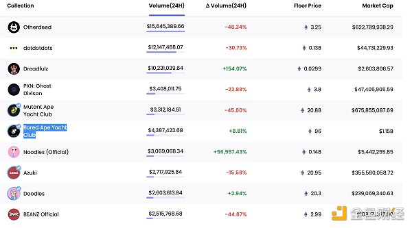 據NFTGo.io數據顯示,過去24小時,Otherdeed的交易量跌幅近50%,MutantApeYachtClub(MAYC)的跌幅約為46%,Azuki系列NFT跌幅為15.58%。截至9日12時,Azuki系列NFT地板價為20.95ETH,24小時跌幅4.2%。無聊猿Bored Ape Yacht Club地板價跌破100ETH,降至96ETH,跌幅13.67%。