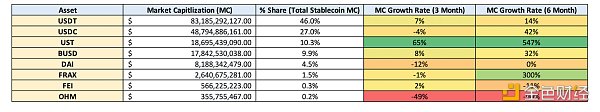 為此,我們將比較上面討論的 8 種資產(USDC、USDT、BUSD、UST、DAI、FRAX、FEI 和 OHM)以及 MIM 和 LUSD(按市值計算的第 6 和第 12 大穩定幣)。