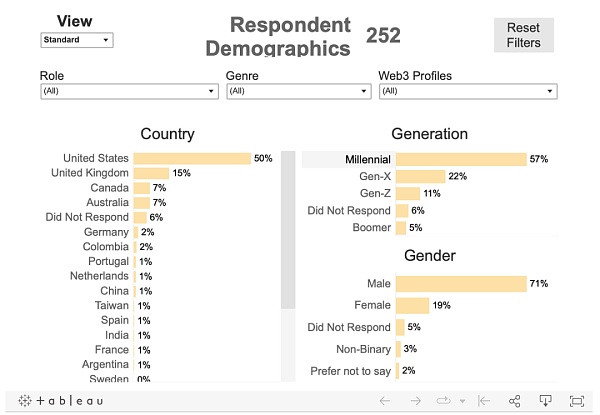 正如人們所料,我們的調查對象中大多數是千禧一代(57%),其次是x世代(22%)。然而,我們驚訝地發現,只有11%的人是z世代——這或許表明,年輕一代可能對音樂/Web3的產業方面不那么看好,或者反過來表明廣泛的W&M網絡向其他世代傾斜。支持前一種解釋的是,當我們在數據中探索世代和Web3 Profiles之間的關系時,我們發現z世代的受訪者是最不可能擁有NFT的一代——只有29%的人報告擁有NFT,相比之下,千禧一代是41%,x世代為38%,嬰兒潮一代的比例為33%。