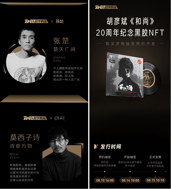 例如騰訊音樂宣布推出《音樂人不止音樂人》數字藏品系列和胡彥斌《和尚》20周年紀念黑膠NFT,成為國內數字藏品領域首個音樂平臺,未來或將被應用在數字專輯及限量周邊產品中。