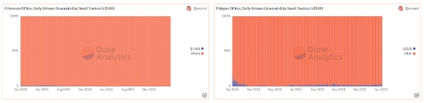 但是,這些小規模的交易商的真正貢獻是什么?如下圖所示,這些用戶的邊際價值非常低。即使在 Polygon DEXes 上,這些用戶每天只貢獻了約 1% 的交易量,而在以太坊上,他們最多只占交易量的 0.1%。