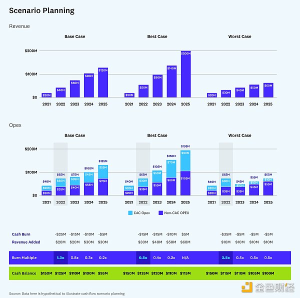 支出回報比和估值倍數分別代表增長的效率和需要增長目標。 然而,當融資環境發生變化,獲得資金變得更加不確定和更加昂貴時,必須謹慎控制公司現金流以致于可以在較長時間內正常運轉。 提前做好充足的準備有助于考慮宏觀事件(戰爭、供應鏈問題、通貨膨脹)如何影響績效指標,如增長和 CAC。 密切關注現金支出并制定方案計劃有助于根據績效快速調整支出和投資。