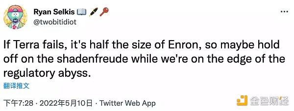 正如 Twitter 上呈現的所有苦難一樣,面對 UST 崩潰有人歡喜有人愁。一些人,比如 Messari Crypto 的創始人 Ryan Selkis,警告稱當天事件的影響可能遠遠超出 Terra 本身的成敗。