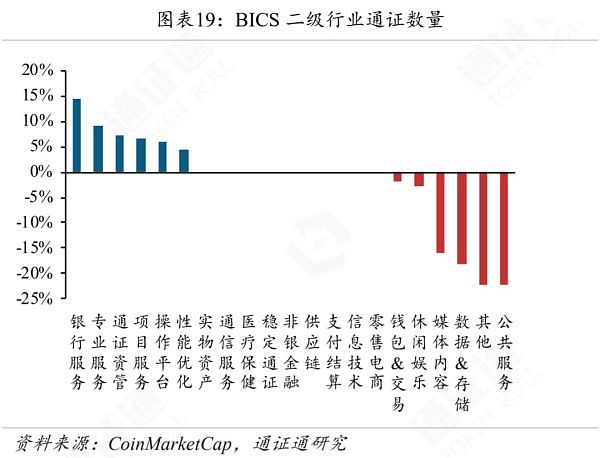 本周通證數量增長較為明顯的BICS二級行業為銀行服務、專業服務,下降較為明顯的有公共服務、數據存儲等。