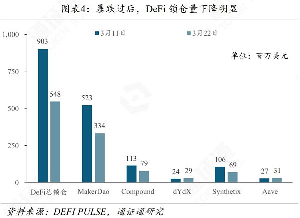 DeFi鎖倉量也大幅下降。截至3月22日12時,DeFi 的總鎖倉量從11日9.03億美元下降到5.48億美元,下降近40%。