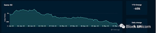 但作為一名在游戲中投入大量時間的投資者,我認為Web3游戲的某些方面我們并沒有注意到。所以今天我想花點時間解釋一下,為什么Web3游戲領域的潮流不可能在未來消失。這個話題首先引起我的興趣是在查閱Nansen的行業NFT指數時。我注意到包含50款游戲的指數自今年年初以來已經下跌了65%。相比之下,標準普爾500指數下跌了17%,比特幣下跌了37%有多。幸運的是,我們有STEPN,幫助我們走路賺錢。