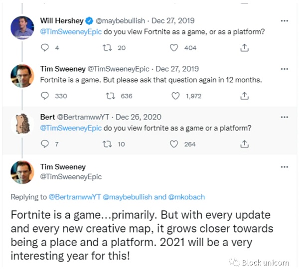 Web3游戲可能會繼續存在的另一個原因是,它們釋放了完全不同的經濟因素。交易員/做市商、投機者和公會可以幫助創造對發行商和游戲玩家都有利自我維持的生態系統。一款理想的游戲將演變為一個平臺,而不是只賣一次的物品。獨立的第三方用戶將能夠創建服務、開發體驗并進行銷售。你覺得這太牽強了嗎?看一下他們在推特上的互動(下圖)。