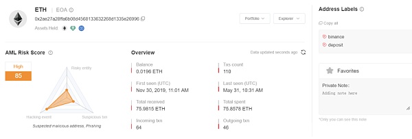 接著,我們使用 MistTrack 分析釣魚地址 1: