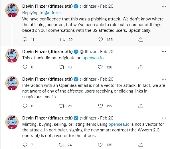 根據Opensea的CEO Devin Finzer發布的twitter,攻擊者是通過釣魚的方式獲取到用戶在Opensea上的掛單授權。