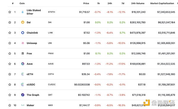 DeFi項目鎖定資產前十排名及鎖倉量 數據來源:defillama