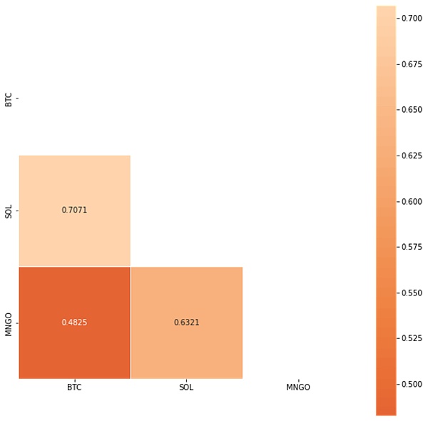 盡管 Mango 最近的財務管理活動并不真正構成互換,但我們認為,在我們回答回報相關性是否強的問題時,值得研究其購買 Marinade 質押的 SOL 而不是其最初購買 BTC 的計劃的決定 在 L1 生態系統中。我們檢查了可追溯到 Mango 代幣下降(2021 年 9 月)前后的每日日志返回,以了解 BTC、SOL 和 MNGO 之間存在哪些相關性。具有 R2 值的相關矩陣如下圖所示: