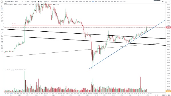 在近期市場整體回暖的帶動下,LTC也突破了一直處于的區間震蕩箱體上沿,同時也是18年熊市最低與19年小牛回落最低連線的周線壓制線,而后價格迎來快速拉升,一直漲至目前46美金上方,圖形上看也開始接近前期下跌中繼支撐位置,這個位置也是存在一定的拋壓阻力,也是前期頂點84.4美金下來的斐波那契61.8%回撤位置,這個位置也是形成了共振壓力帶,后續反彈空間想繼續拉大,必須放量突破,均線上也和其余主流幣一樣,包括指標上也都顯示短線多頭趨勢,多頭量能也未發散完畢,短線有望保持強勢,操作上沿5日線持有為主。