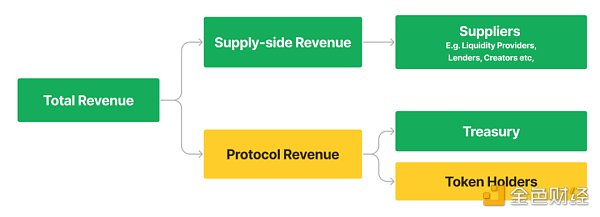 Supply-side Revenue:是指的由 Suppliers(資金的供給方)產生的,比如 Defi 中的所有流動性提供者,借貸中的所有借款人,Staking 中的所有出資人等角色,他們在扣除本金后獲得的收益。這一部分價值由 suppliers 創造,收入也自然歸屬于他們。