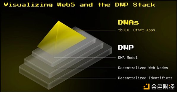 從技術上講,Web5 將專注于身份而非 Token 化支付,簡單點說就是——TBD 計劃構建一個去中心化 Web 平臺(DWP),讓開發人員使用去中心化標識符(DID)和去中心化 Web 節點(DWN)來創建去中心化 Web 應用程序(DWA)。